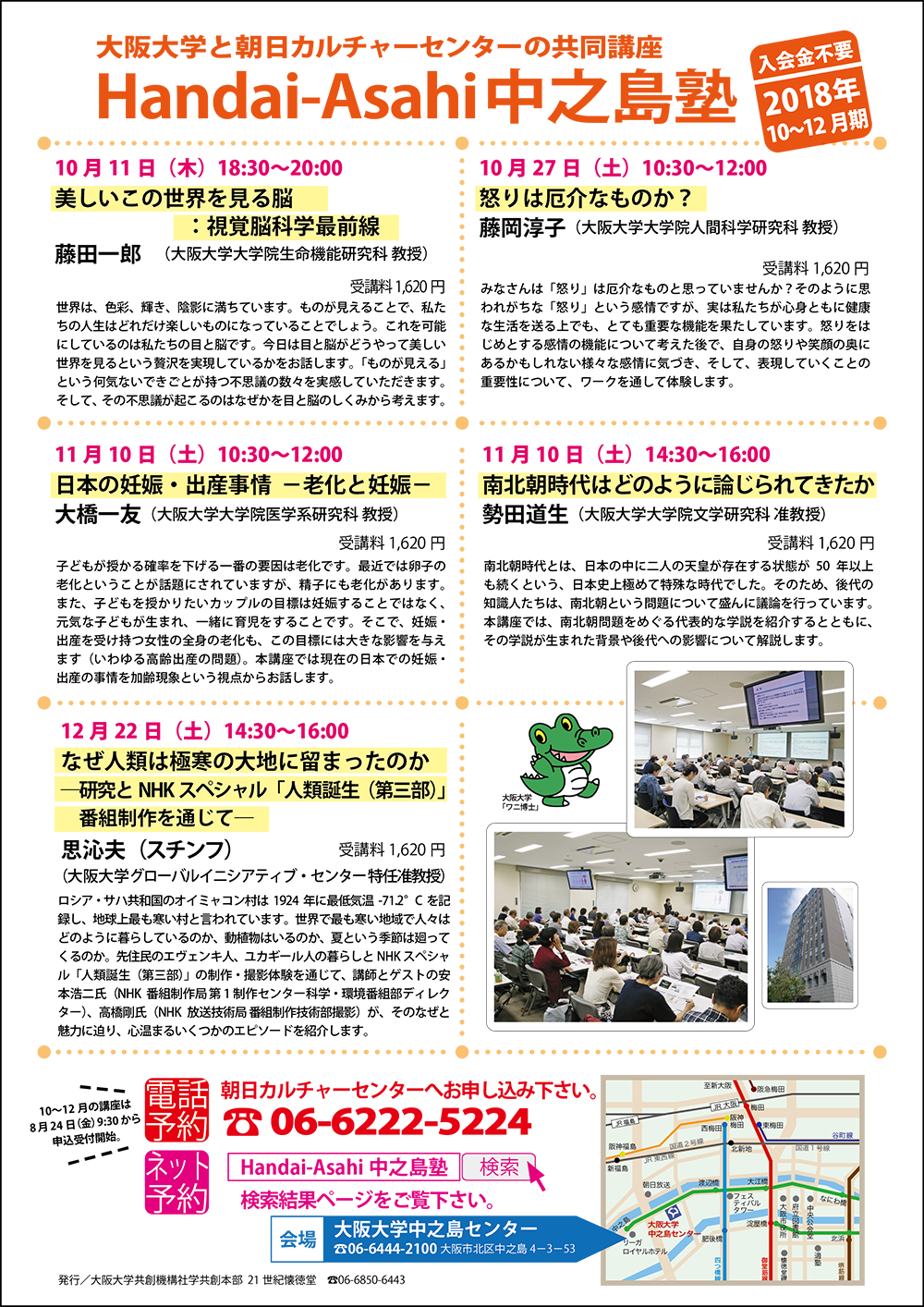 | 主催 | 大阪大学共創機構社学共創本部21世紀懐徳堂、朝日カルチャーセンター |