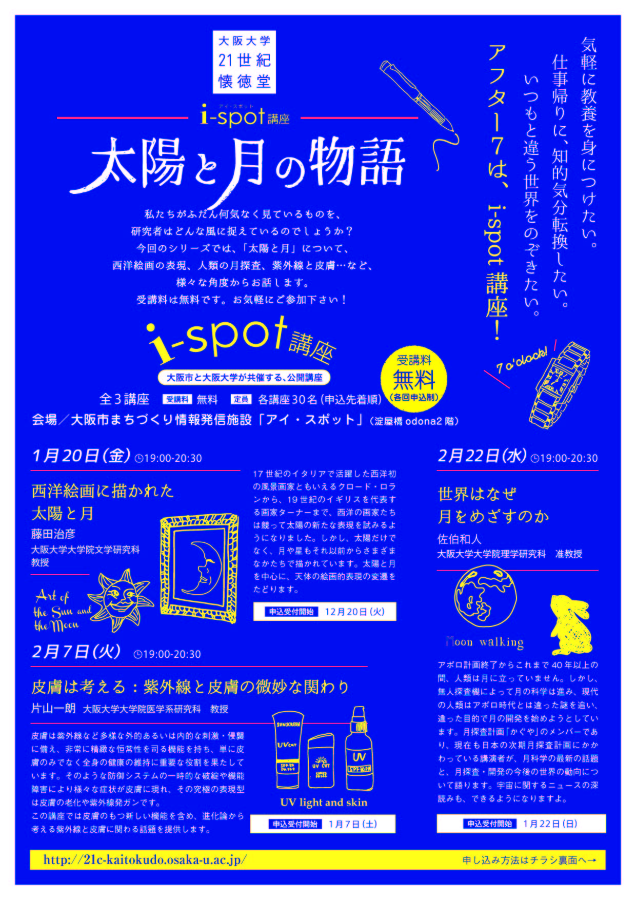 大阪市と大阪大学が共同で市民のみなさまに提供する公開講座です。それぞれの専門分野から、ともに「学び合う」を意識したテーマ設定と講座スタイルが特徴です。今期は「大阪、まちの景色」と「太陽と月の物語」の2シリーズ。受講料は無料です。お気軽にご参加ください!