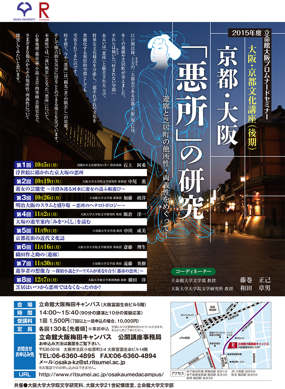 11月16日(月)に立命館大学梅田キャンパスで、2015年度後期 大阪・京都文化講座「京都・大阪「悪所」の研究—遊郭と芝居町の他所性・両義性をめぐってー」の第6回講座が行われ、109人が受講しました。