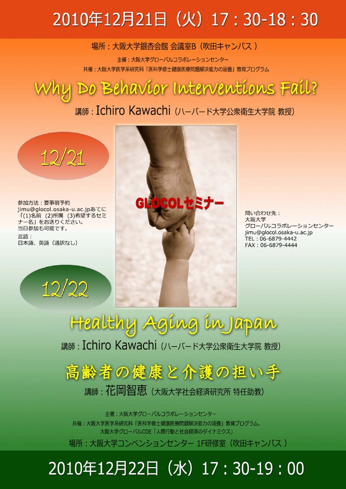 【 講 師 】 Ichiro KAWACHI(ハーバード大学公衆衛生大学院教授)、花岡 智恵(大阪大学社会経済研究所特任助教)