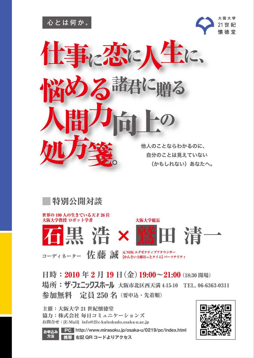 20 代30代の社会人と学生を対象に「石黒浩×鷲田清一特別公開対談『心とは何か。〜仕事に恋に人生に悩める諸君に贈る人間力向上の処方箋〜』」を開催しま す。アンドロイド研究で世界に名を馳せる石黒浩教授と大阪大学のリーダーであり哲学者でもある鷲田清一総長が、真正面から「人間とは。心とは。」について 議論します。みなさまのご参加をお待ちしております。