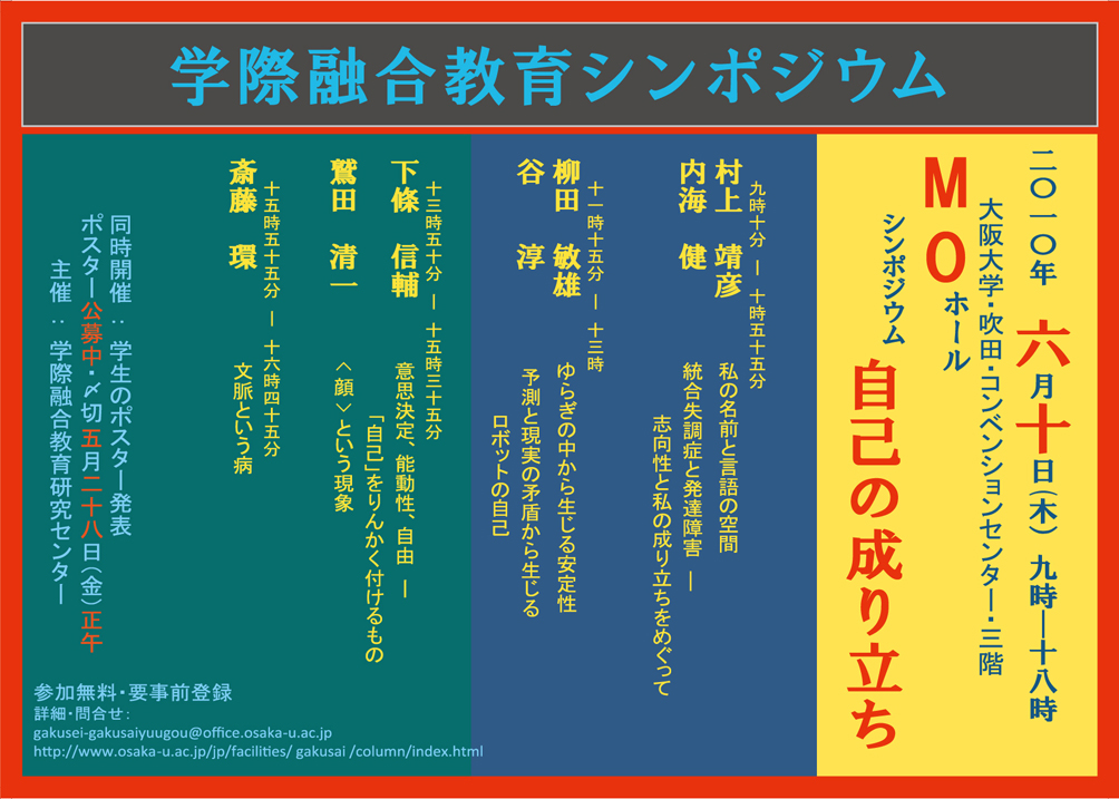 2010年6月10日(木)吹田キャンパス コンベンションセンター MOホールにて、学際融合教育シンポジウム「自己の成り立ち」を開催いたします。ぜひご参加下さい。