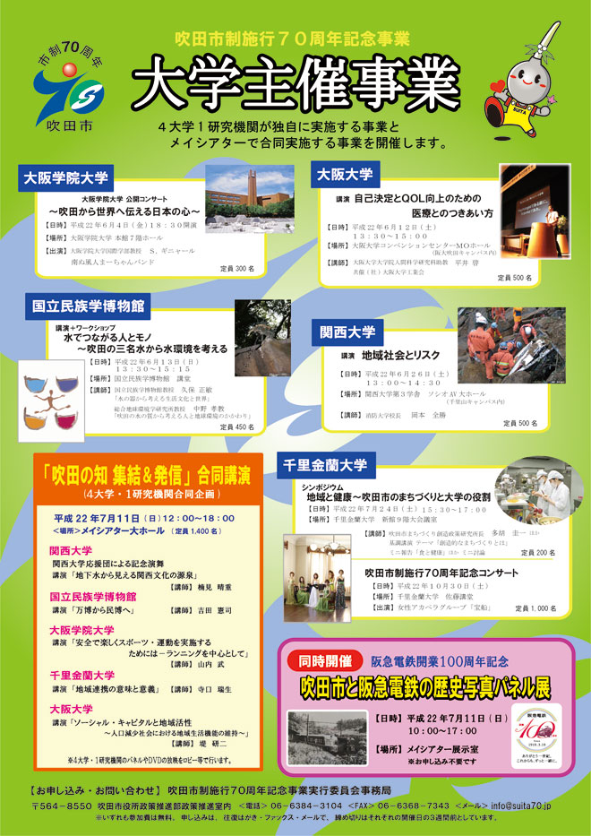 吹田市が平成22年4月1日に市制施行70周年を迎えたことを記念し、吹田市制施行70周年記念事業大学主催事業として、以下のとおり合同講演会を開催します。みなさまのご参加をお待ちしております。