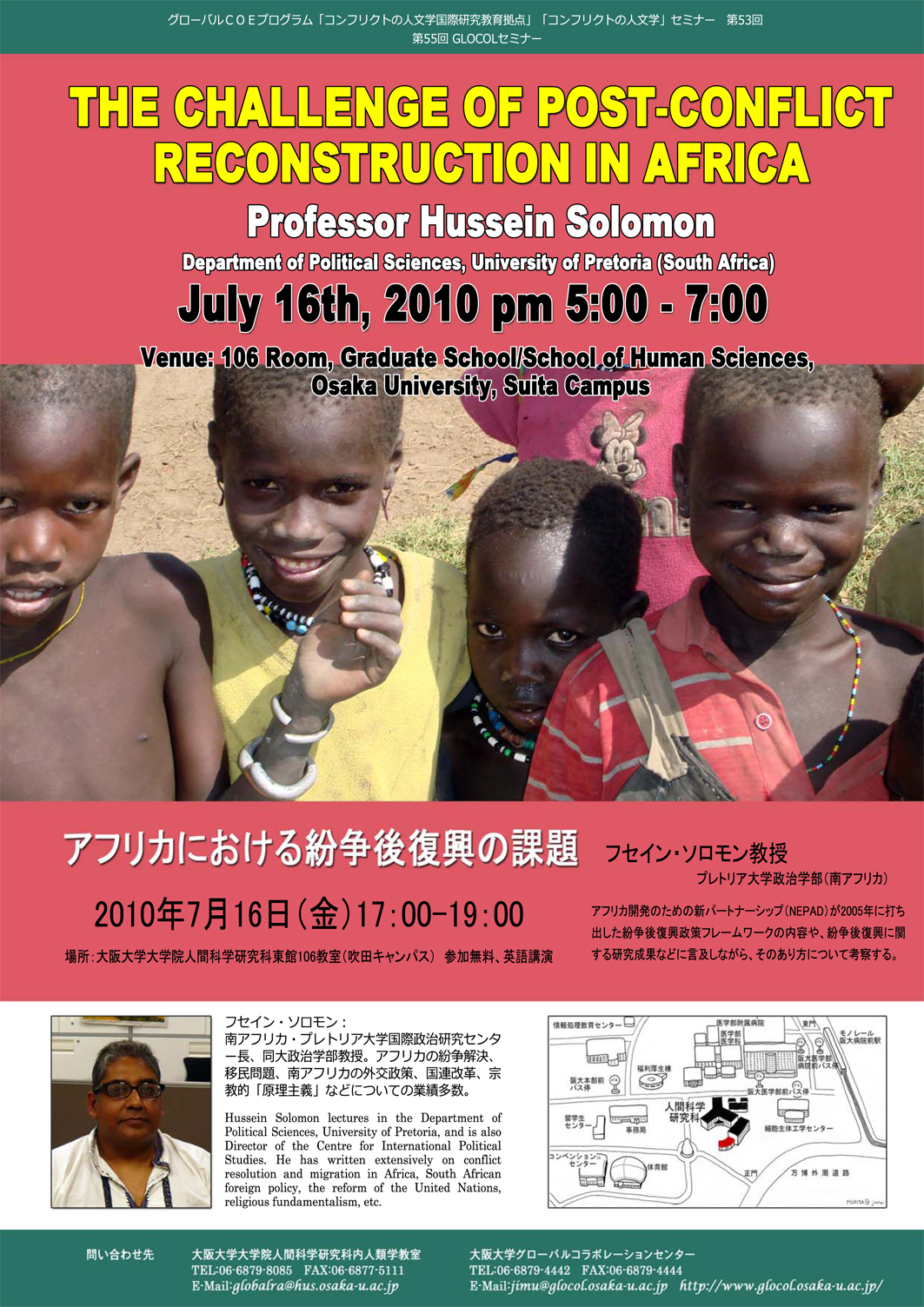| 主催 | 大阪大学グローバルCOEプログラム「コンフリクトの人文学国際研究教育拠点」、大阪大学グローバルコラボレーションセンター |