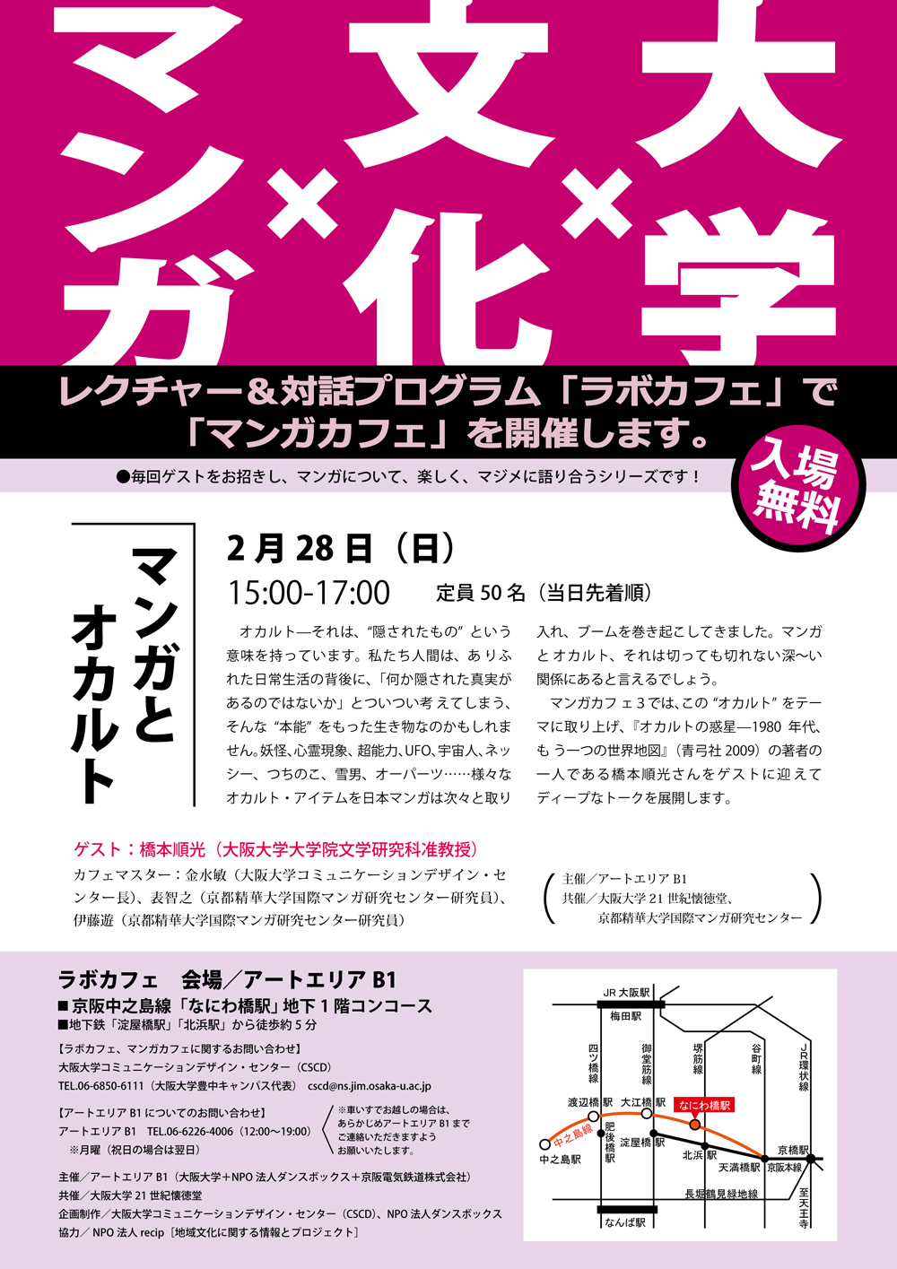 レクチャー&対話プログラム「ラボカフェ」で、「マンガカフェ」を開催します。マンガ×大学×文化をテーマに、ゲストとともに真面目に楽しく語り合っていきます。シリーズ第3回となる今回のテーマは「マンガとオカルト」。マンガと切っても切れない深い縁にあるオカルトについて、橋本順光准教授を迎え、ディープに語らいましょう。みなさまのご参加をお待ちしています。