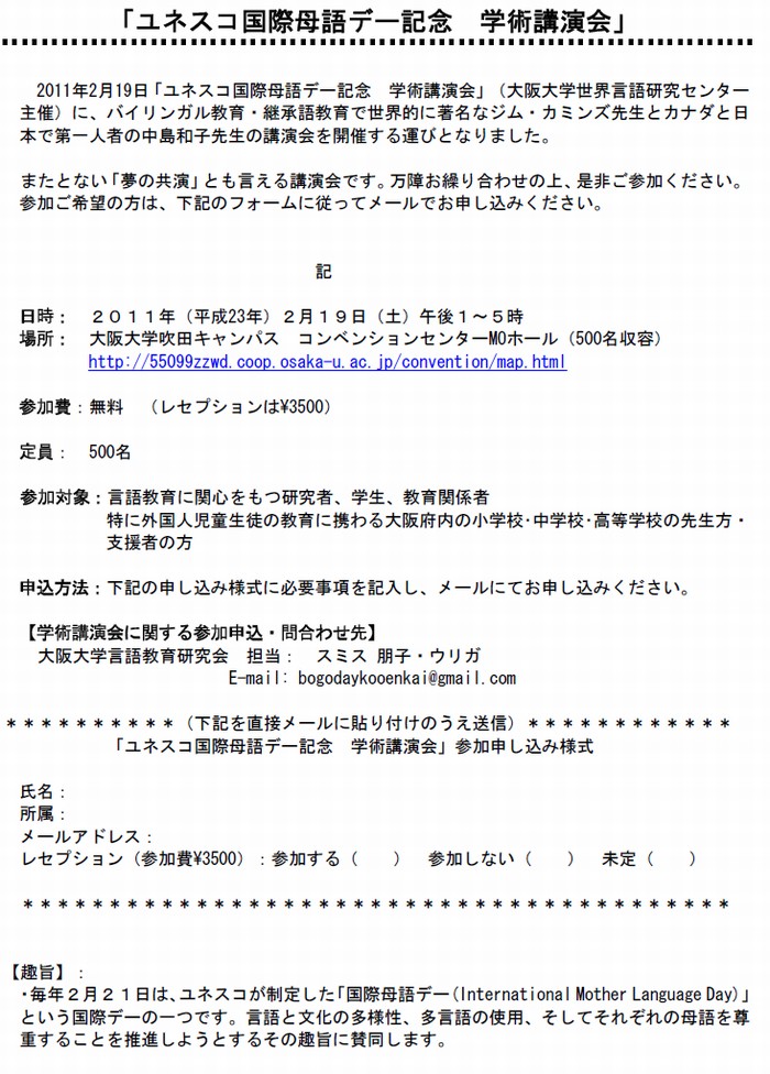 ユネスコが制定した2月21日の「国際母語デー」の趣旨に賛同し、バイリンガル教育・継承語教育で世界的に著名なトロント大学ジム・カミンズ教授およびカナダと日本で第一人者のトロント大学名誉教授中島和子先生による学術講演会を開催します。