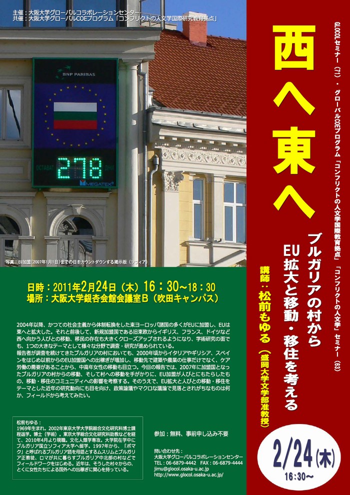 報告者が調査を続けてきたブルガリアの村においても、2000年頃からイタリアやギリシア、スペインをはじめ以前からのEU加盟国への出稼ぎが増加し、移動先で建築や農業の仕事だけでなく、ケア労働の需要があることから、中高年女性の移動も目立つ。今回の報告では、2007年に加盟国となったブルガリアの村からの移動、そして村への移動を手がかりに、EU加盟が人びとにもたらしたもの、移動・移住のコミュニティへの影響を考察する。そのうえで、EU拡大と人びとの移動・移住をテーマとした近年の研究動向にも目を向け、政策論議やマクロな議論で見落とされがちなものは何か、フィールドから考えてみたい。