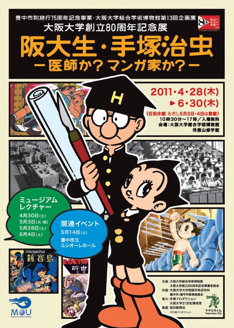 | 主催 | 大阪大学総合学術博物館、大阪大学創立80周年記念事業委員会 共催:大阪大学大学院医学系研究科、豊中市・豊中市教育委員会 協力:手塚プロダクション、大阪大学21世紀懐徳堂 |