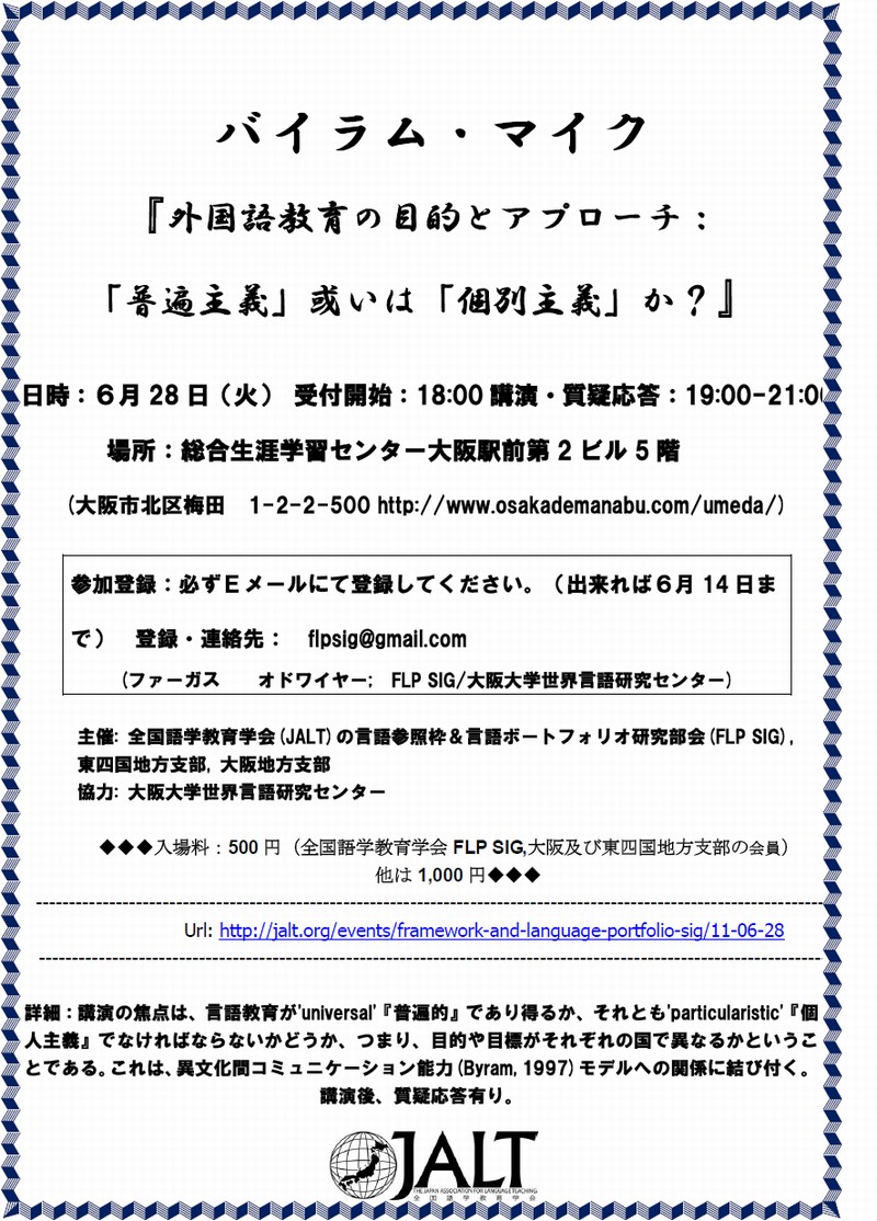 主催 全国語学教育学会(JALT)の言語参照枠&言語ポートフォリオ研究部会(FLP SIG),東四国地方支部,大阪地方支部