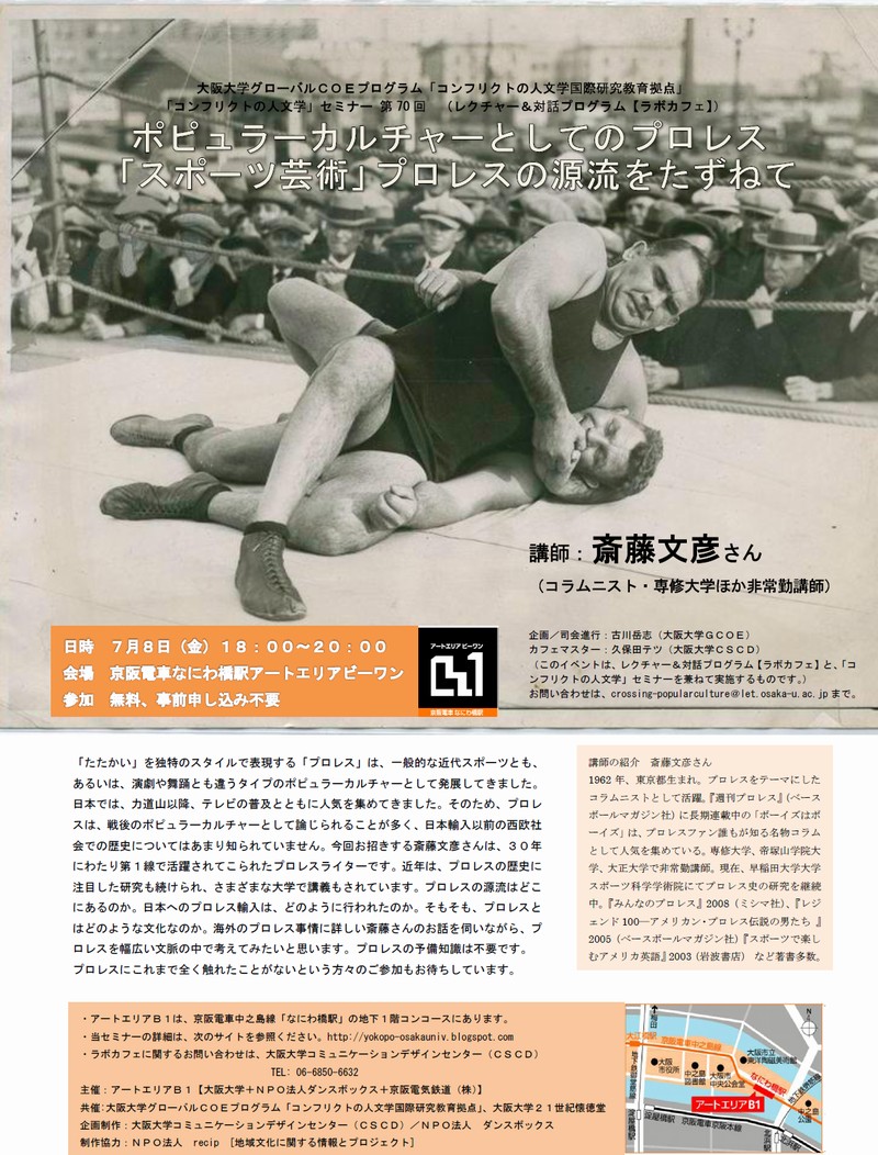ゲストに斎藤文彦さん(コラムニスト・専修大学ほか非常勤講師)をお迎えし、ポピュラーカルチャーの側面からプロレスというジャンルの歴史について考えます。 「たたかい」を独特のスタイルで表現する「プロレス」は、近代スポーツとも、あるいは、演劇や舞踊とも違うタイプのポピュラーカルチャーとして発展してきました。プロレスの源流はどこにあるのか。日本へのプロレス輸入は、どのように行われたのか。そもそも、プロレスとはどのような文化なのか。海外のプロレス事情に詳しい斎藤さんのお話を伺いながら、プロレスを幅広い文脈の中で考えてみたいと思います。