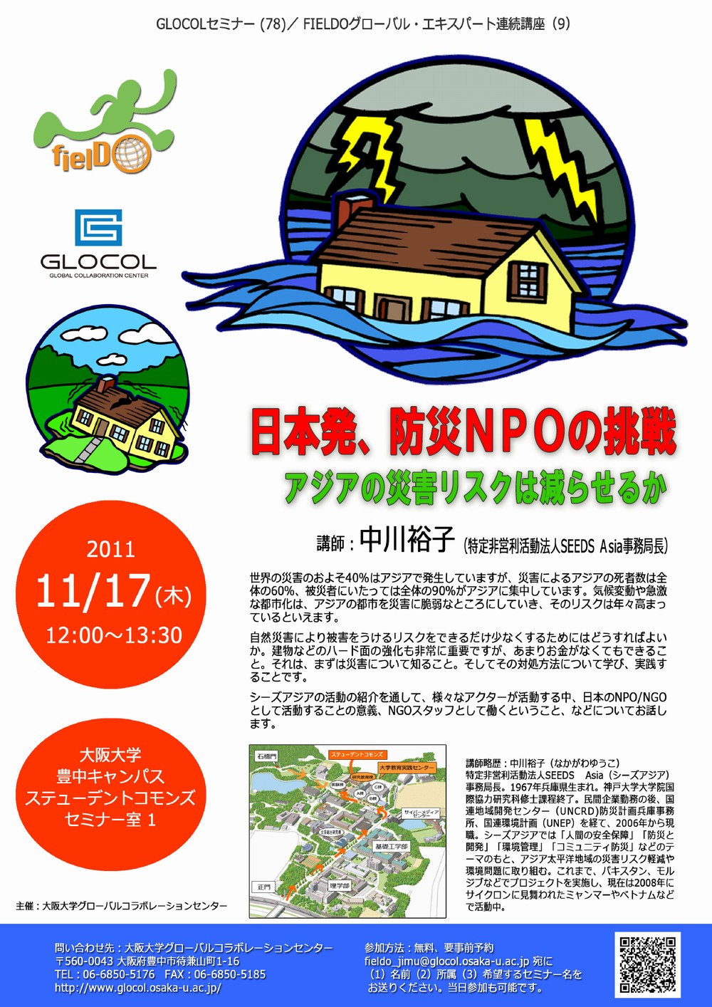 世界の災害のおよそ40%が発生しているアジア。気候変動や急激な都市化は、アジアの都市を災害に脆弱なところにしていき、自然災害により被害をうけるリスクは年々高まっている といえます。リスクをできるだけ少なくするためにはどうすればよいか。まずは災害について知ること。そしてその対処方法について学び、実践することです。 シーズアジアの活動の紹介を通して、様々なアクターが活動する中、日本のNPO/NGOとして活動することの意義、NGOスタッフとして働くということ、などについてお話します。