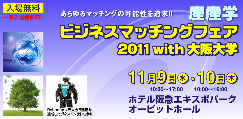 北大阪地域の中堅・中小企業が出展ブースを設け、それぞれの得意とする製品・技術・サービスを展示することにより、大阪大学および一般来場者と出展企業間での産産学マッチングの実現を目的としています。 すなわち、企業との連携を目指している研究者のための「パートナー探しの場」、企業に対するシーズの連携提案(共同・受託研究への展開)、研究者が必要としているニーズの企業への提案(試作品作成など)を目指します。