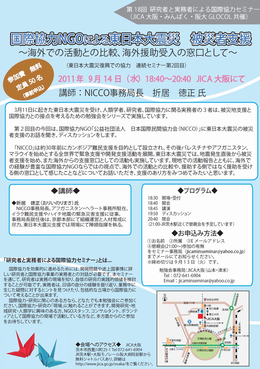 「NICCO」は約30年前にカンボジア難民支援を目的として設立され、その後 全世界で緊急支援や開発支援活動を展開。東日本大震災では、地震発生直後 から被災者支援を始め、また海外からの支援窓口としての活動も実施してい ます。現地での活動報告とともに、海外での経験が豊富な国際協力NGOなら ではの視点で、海外での活動との比較や、援助する側ではなく援助を受ける 側の窓口として感じたことなどについてお話いただき、支援のあり方をみつ めてみたいと思います。