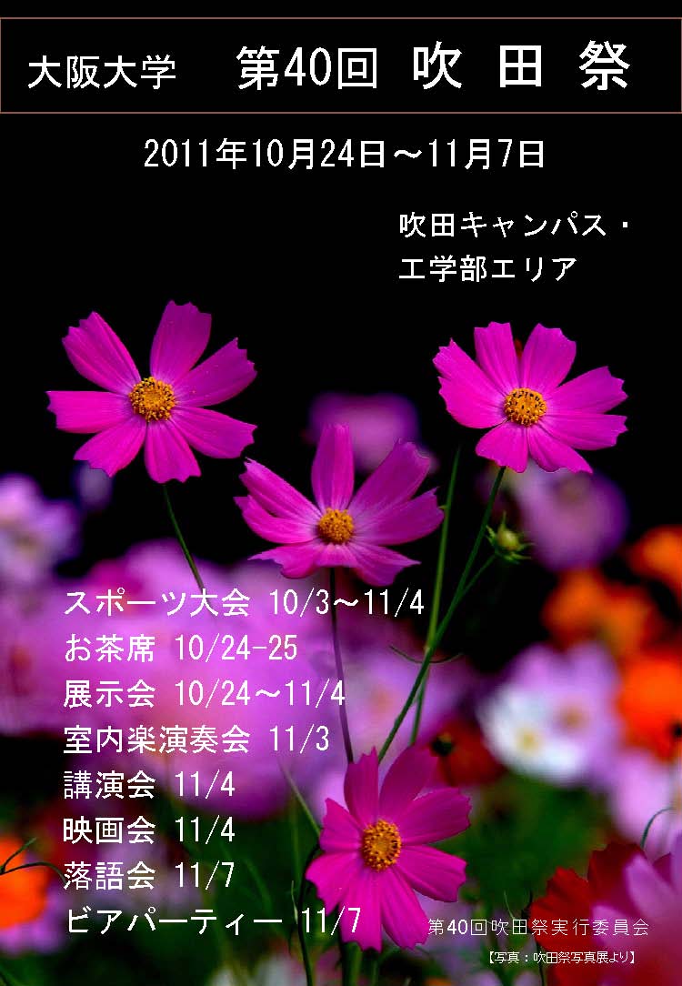 大阪大学が吹田の地に移ってきてから絶えることなく行われてきた「吹田祭」は今年で記念すべき40回目を迎えます。約1ヶ月かけて行われるスポーツ大会は学生中心ですが、「講演会」「映画会」「落語会」「写真展」「お茶席」「室内楽演奏会」ほか、地域の皆さんにも楽しんでいただけるイベントも目白押しです。平日のイベントが多いのでお勤めの方はややお出かけにくいかと思いますが、秋の一日、吹田キャンパスに足を向けていただけましたら幸いです。