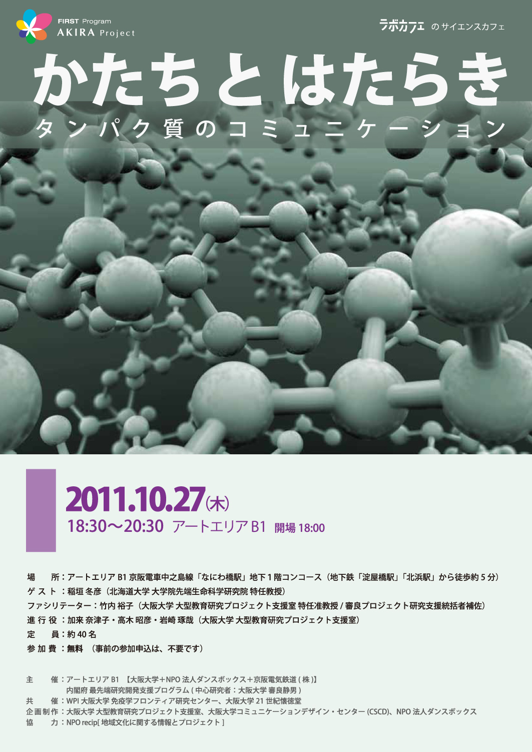 | 主催 | アートエリアB1 【大阪大学+NPO 法人ダンスボックス+京阪電気鉄道( 株)】、最先端研究開発支援プログラム】、内閣府 最先端研究開発支援プログラム(中心研究者:大阪大学 審良静男) |