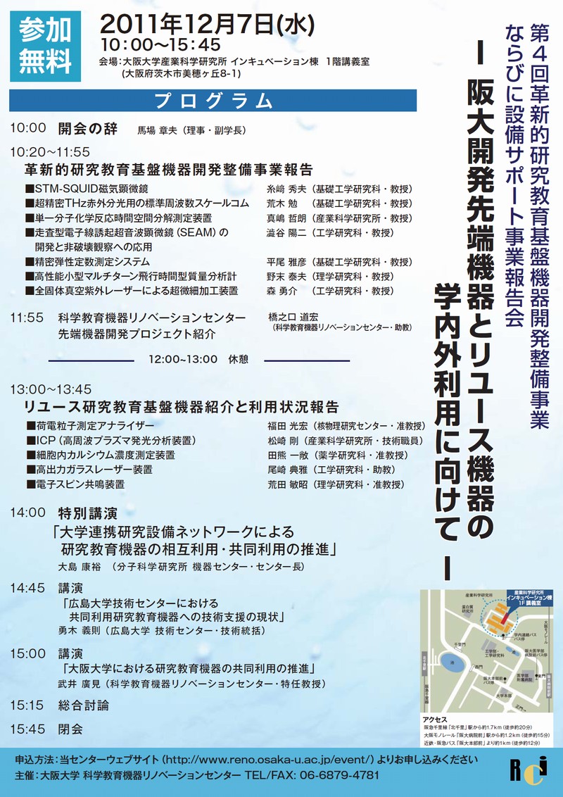 大阪大学 科学教育機器リノベーションセンターは、「阪大オンリーワン」を標榜し、手作りで独創性のある有用な汎用先端機器を開発し、これらを学内外の共同利用に供することを目標とした革新的研究教育基盤機器開発整備事業と、汎用性の高い研究教育機器を修理、バージョンアップすることで効率的な利用促進を行うリユース研究教育基盤機器整備事業等の成果を報告致します。 これらの事業は、全国に先駆けた取り組みでもあり、教育研究機器の整備と共同利用の「モデル」として波及することを願っております。 今年度の事業報告会では、これら2事業の成果報告とあわせて、産官学間の教育研究施設・機器の共同利用・有効利用に向けた講演会を致します。総合討論を交え、皆様とともに今後の課題・問題点についても提起していきたいと思います。 是非ご参加ください。