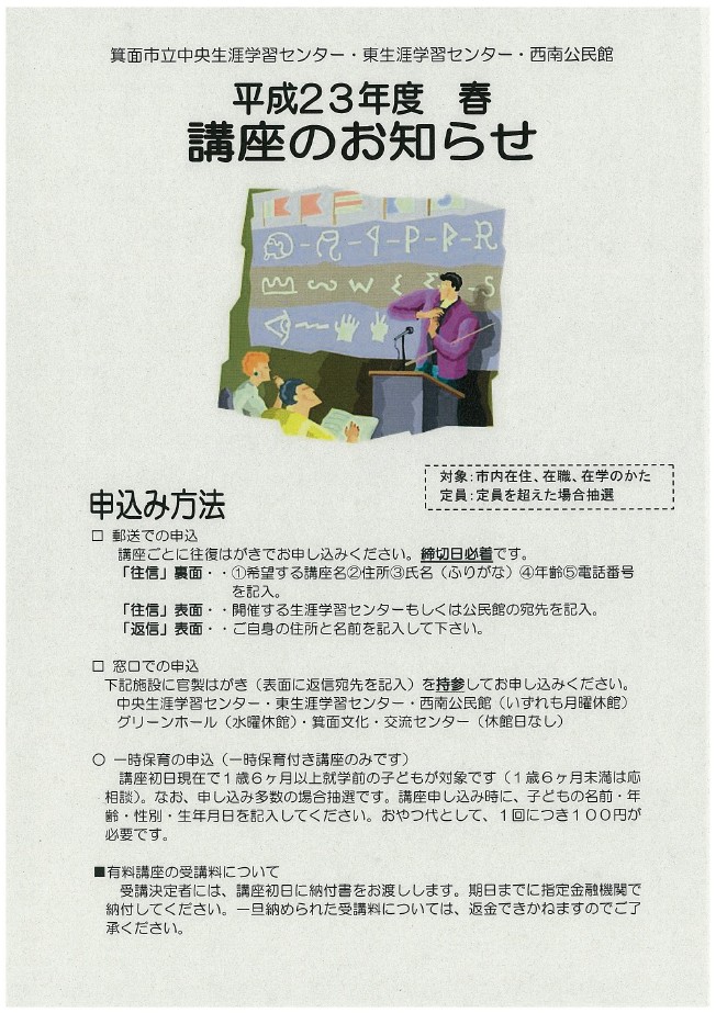 問い合わせ先 http://www.city.minoh.lg.jp/cyuuou/kouza/cyuou_harui_h23.html