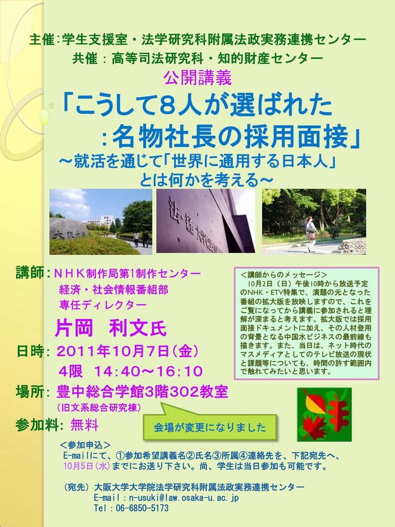 法学研究科附属法政実務連携センター(Tel: 06-6850-5173) http://www.law.osaka-u.ac.jp/clpp/index.html |