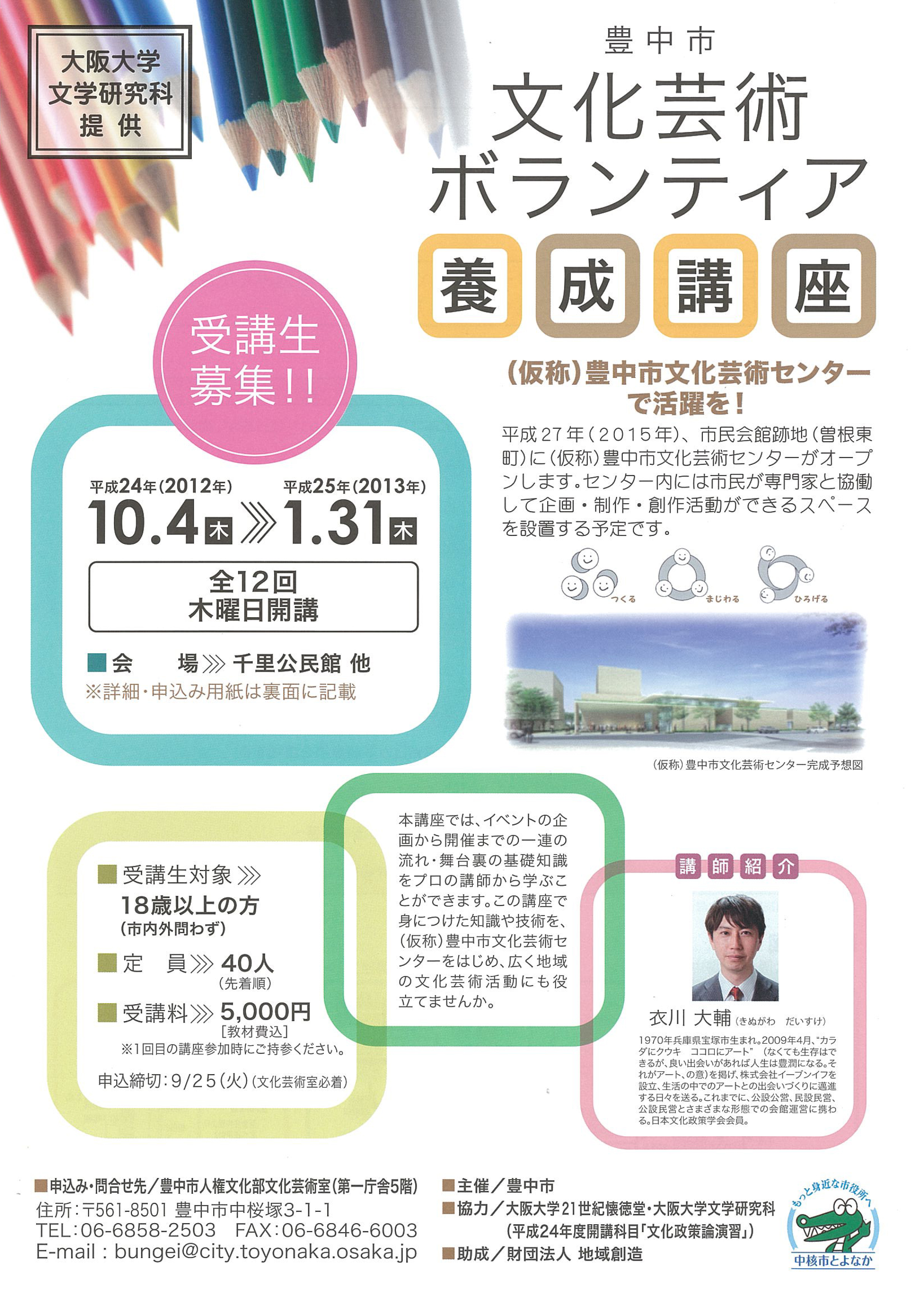 豊中市人権文化部 文化芸術室 http://www.city.toyonaka.osaka.jp/top/kakubu/jinkenbunka/bunkageijutu/index.html |