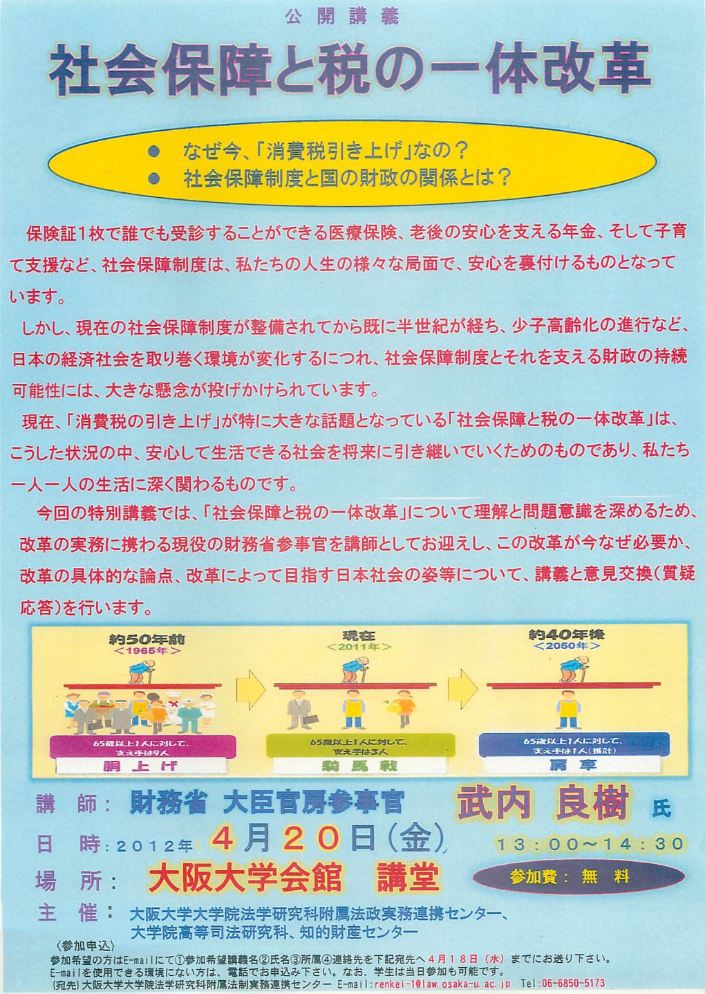 今回の特別講義では、「社会保障と税の一体改革」について理解と問題意識を深めるため、改革の実務に携わる現役の財務省参事官を講師としてお迎えし、この改革が今なぜ必要か、改革の具体的な論点、改革によって目指す日本社会の姿等について、講義と意見交換(質疑応答)を行います。
