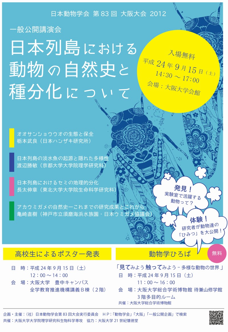 | 主催 | (社)日本動物学会第83回大会実行委員会 / 共催:大阪大学大学院理学研究科生物科学専攻、大阪大学総合学術博物館 |