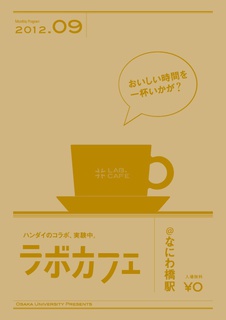 「ラボカフェ」は、京阪中之島線の新駅 "なにわ橋駅"(2008年10月19日開業)構内のコミュニティースペース「 アートエリアB1 」で大阪大学が開催しているレクチャー&対話イベント。大阪大学の教員らがカフェマスターとなり、平日夜を中心に、哲学、アート、科学技術、鉄道、マンガ、スポーツなど、多岐にわたるテーマで、ゲストや参加者のみなさんで語り合うカフェプログラムを提供しています。