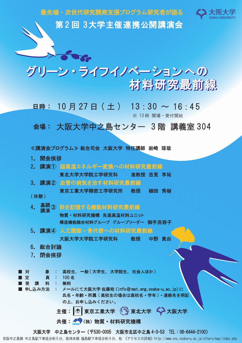 2011年に日本学術振興会の「最先端・次世代研究開発支援プログラム」に採択された4名の研究者による、三大学(大阪大学・東北大学・東京工業大学)主催、物質・材料研究機構(NIMS)共催の連携公開講演会です。 今回は大阪大学中之島センターを会場に、産業・医療の場で活用される最前線の材料研究を、高校生にも分かりやすくお話します。