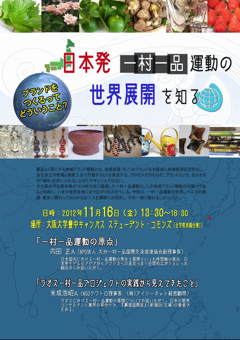 最近よく耳にする地域ブランド戦略とは、地域資源(モノ)のブランド化を起点に地域経済を活性化し、自主自立の気風と創意工夫で行動するヒトを育成する、プロセスそのものだ。ブランドという、自分たちの「焼印」を手に入れることはたやすいことではない。 大分県の平松前知事が1970年代末に提唱した一村一品運動は、この地域ブランド戦略の先駆けであると同時に、いまや世界各地にまで広がりをみせている。今回は、一村一品運動の世界レベルでの実践・普及に関わっておられるお二人を講師にお招きし、その一端に触れることにしたい。
