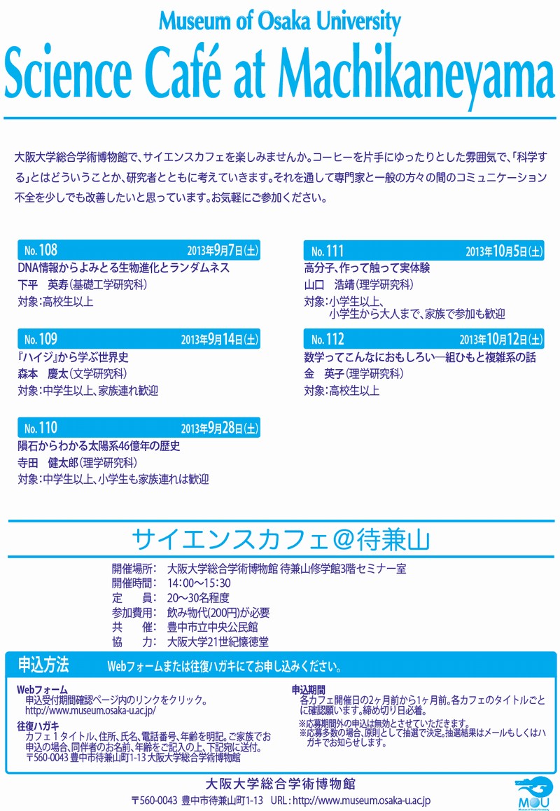 | 主催 | 大阪大学総合学術博物館 共催:豊中市立中央公民館 協力:大阪大学21世紀懐徳堂 |