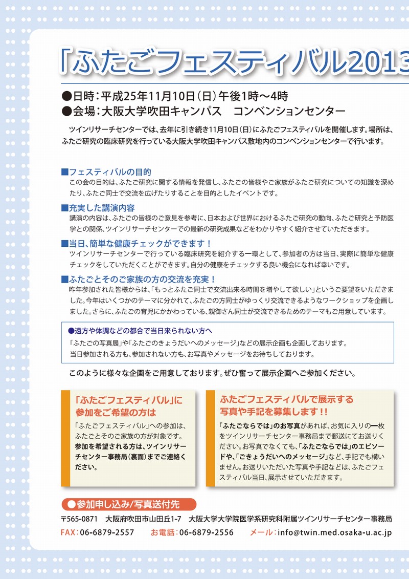 大阪大学大学院医学系研究科附属ツインリサーチセンター事務局 http://www.twin.med.osaka-u.ac.jp/fest2013.html |