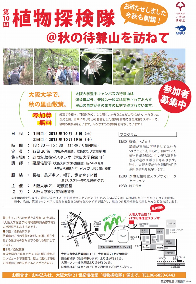 ※小雨は決行します。雨天の場合は21世紀懐徳堂スタジオで『キャンパスに咲く花』に関連したトークセッションを開催。豊中、吹田、箕面キャンパスに見られる豊富な植物をスライドで紹介し、里山の自然や植物との親しみ方などをお話します。