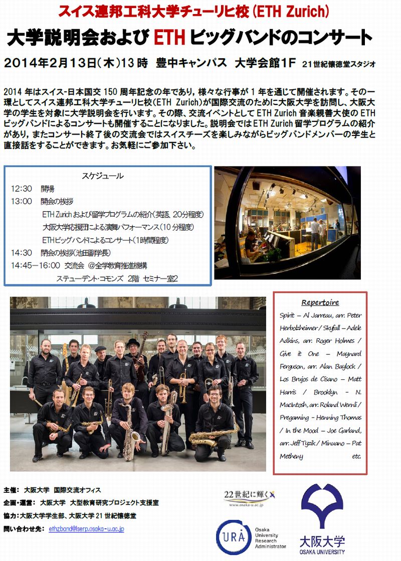 2014年はスイス-日本国交150周年記念の年であり,様々な行事が1年を通じて開催されます。その一環としてスイス連邦工科大学チューリヒ校(ETH Zurich)が国際交流のために大阪大学を訪問し、大阪大学の学生を対象に大学説明会を行います。その際、交流イベントとしてETH Zurich音楽親善大使のETHビッグバンドによるコンサートも開催することになりました。説明会ではETH Zurich留学プログラムの紹介があり,またコンサート終了後の交流会ではスイスチーズを楽しみながらビッグバンドメンバーの学生と直接話をすることができます。お気軽にご参加下さい。
