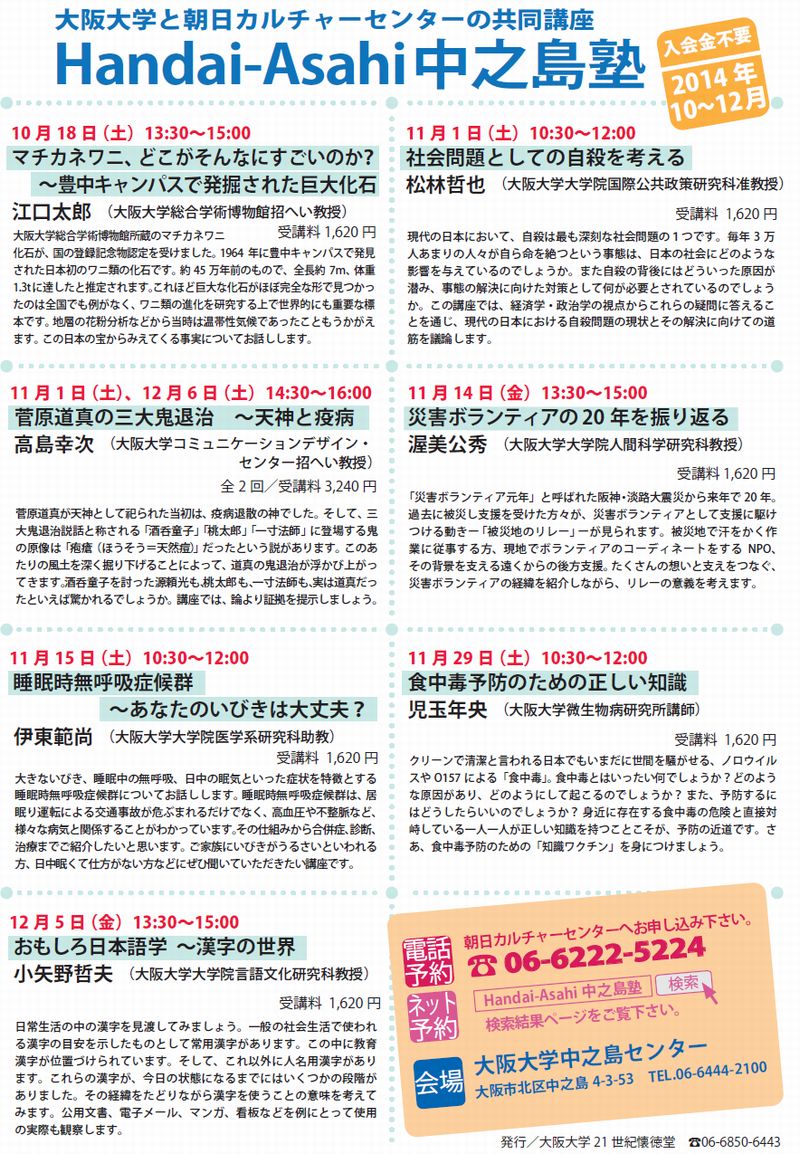 | 主催 | 大阪大学21世紀懐徳堂、朝日カルチャーセンター |