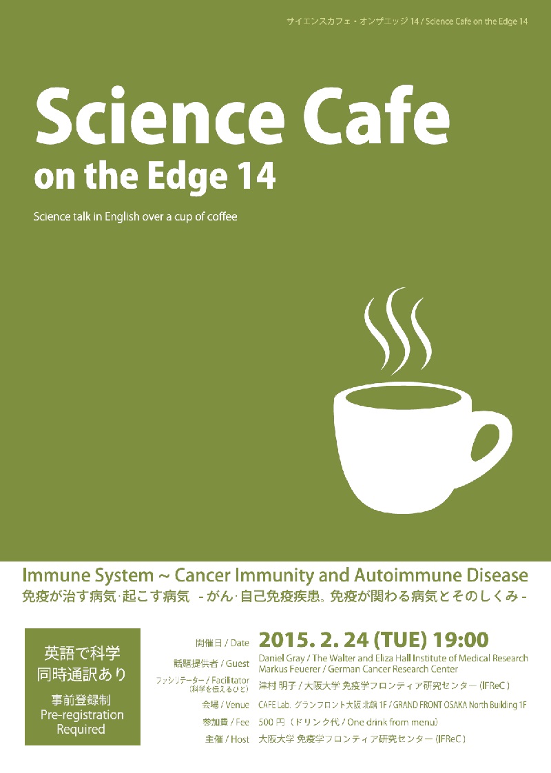 大阪大学免疫学フロンティア研究センター(企画室:津村/奥田) http://www.ifrec.osaka-u.ac.jp/jpn/activities/2014/12/150224-sciencecafe.php |