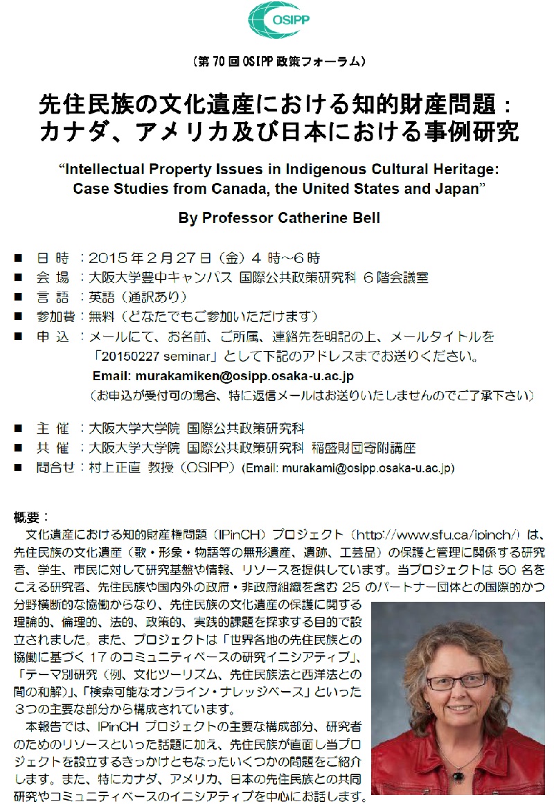 第70回 OSIPP政策フォーラム 「先住民の文化遺産における知的財産問題:カナダ、アメリカおよび日本における事例研究」