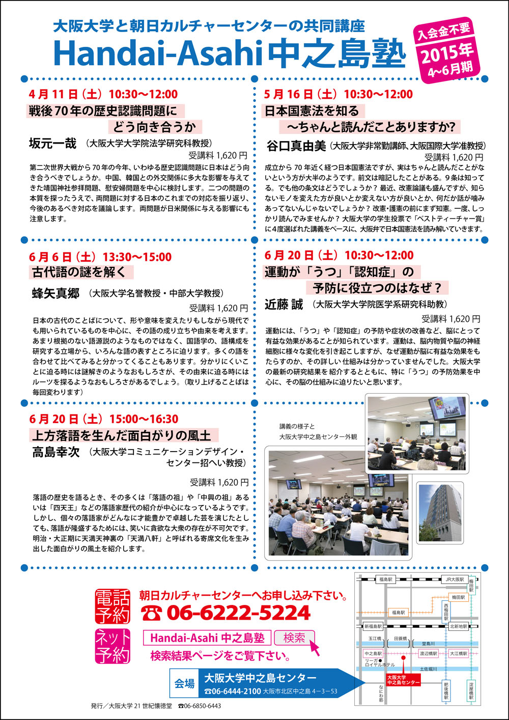 | 主催 | 大阪大学21世紀懐徳堂、朝日カルチャーセンター |