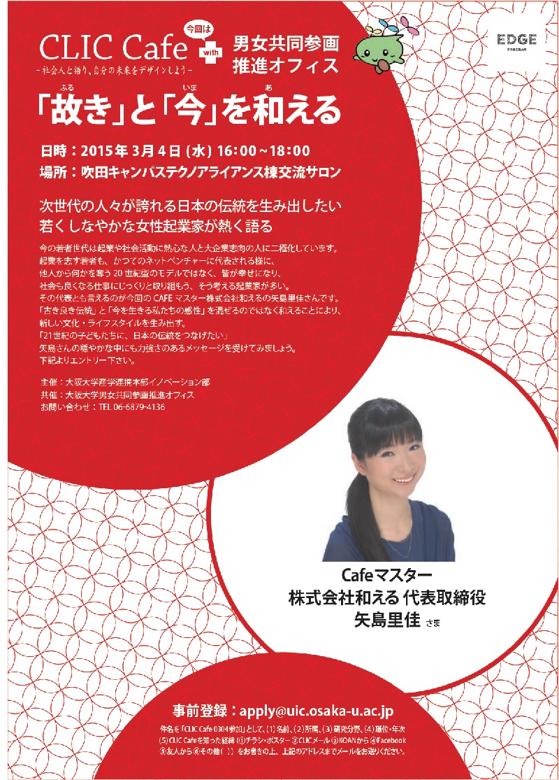 大阪大学では来る3/4(水)、CLIC cafe+ 男女共同参画推進オフィスを開催します。