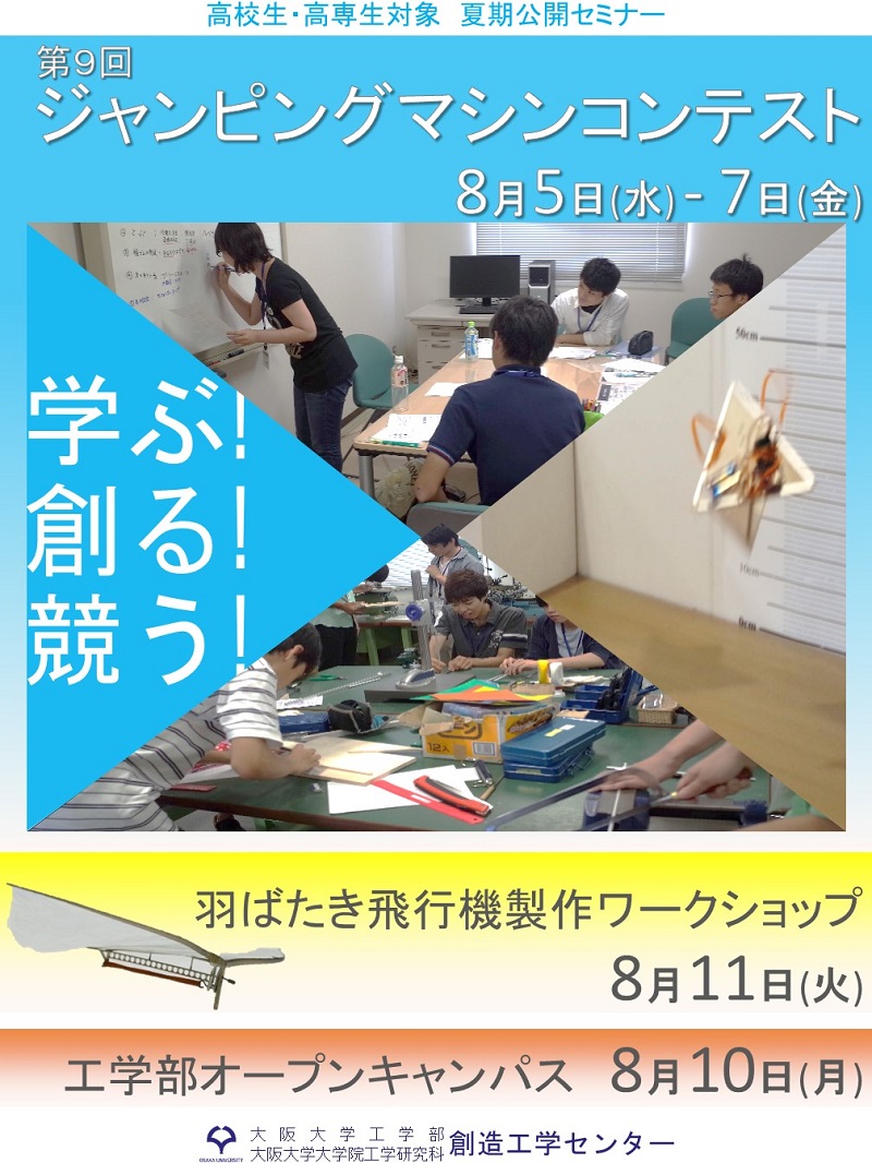 大阪大学 工学部/大学院工学研究科 創造工学センターでは、本学で取り組んでいる創造性教育と中等教育との連携を図ることを目的に、高校生・高専生を対象とした夏期公開セミナー「第9回ジャンピングマシンコンテスト」を開催します。これまでのジャンプの最高記録は247cm。学科・学年は問いません。みなさんの挑戦をお待ちしています!