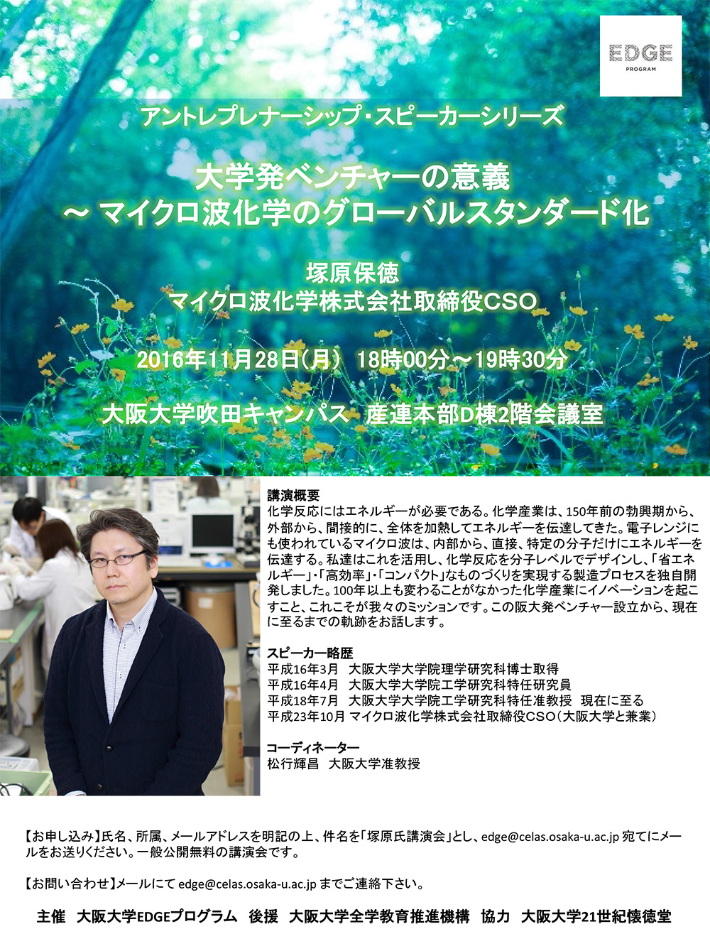 【お申し込み】氏名、所属、メールアドレスを明記の上、件名を「塚原氏講演会」とし、edge@celas.osaka-u.ac.jp 宛てにメールをお送りください。一般公開無料の講演会です。