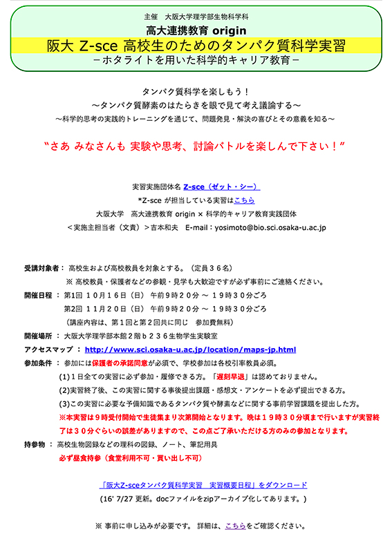 2016年11月20日(日)、豊中キャンパス理学部本館において、 理学研究科生物科学専攻の主催により「高校生のためのタンパク質科学実習 ‐ タンパク質科学を楽しもう!~タンパク質酵素のはたらきを眼で見て考え議論する~ ‐」を開催します。