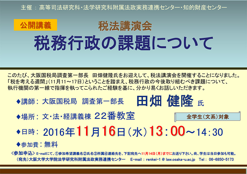 このたび、大阪国税局調査第一部長田畑健隆氏をお迎えして、税法講演会を開催することになりました。「税を考える週間」(11月11~17日)ということを踏まえ、税務行政の今後取り組むべき課題について、執行機関の第一線で指揮を執ってこられたご経験を基に、分かり易くお話いただきます。