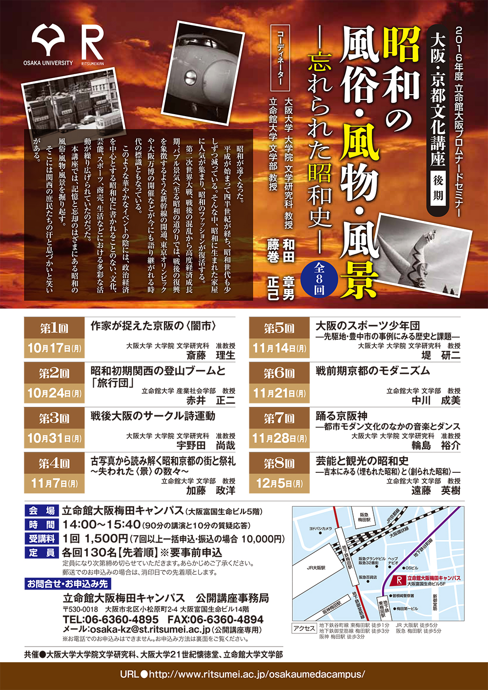昭和が遠くなった。平成が始まって四半世紀が経ち、昭和世代も少しずつ減っている。そんな中、昭和に生まれた家屋に人気が集まり、昭和のファッションが復活する。第二次世界大戦、戦後の混乱から高度経済成長期、バブル景気へ至る昭和の道のりでは、戦後の復興を象徴するような新幹線の開通、東京オリンピックや大阪万博の開催などが今にも語り継がれる時代の標識ともなっている。このような華やかなイベントの陰には、政治経済を中心とする昭和史に書かれることのない、文化、芸能、スポーツ、商売、生活などにおける多彩な活動が繰り広げられていたのだった。本講座では、記憶と忘却のはざまにある昭和の風俗・風物・風景を掘り起す。そこには関西の庶民たちの汗と息づかいと笑いがある。