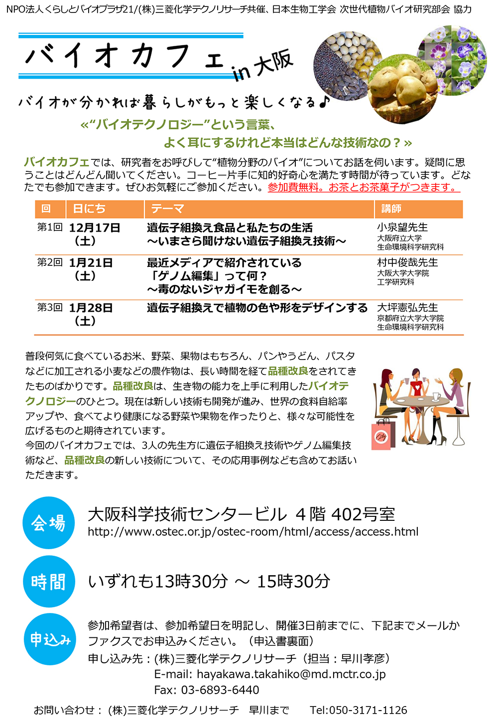 3回にわたり「バイオカフェ in 大阪」と題して、サイエンスカフェを開催します。農林水産分野で進められている最先端の育種技術 (遺伝子組換え技術、ゲノム編集技術等)の開発について、広く一般の方々に理解を深めていただくことを目的としています。 大阪大学工学研究科の村中教授、他2名の講師が、遺伝子組み換え食品、ゲノム編集、植物の潜在力などについて語ります。参加費無料。お茶とお茶菓子が付きます。