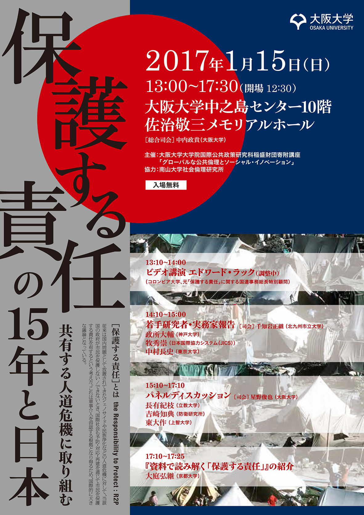 2001年12月に「保護する責任」が提言されてから15年が過ぎた。この間、国際社会では議論が吹き荒れたが、日本 では、人道危機も難民問題もまして人道的介入も「遠い世界の出来事」であり、決して多くは語られてこなかった。 だがその一方で、間違いなく、この世界の人道危機は我々共有の危機である。実際、様々な立場から、この危機と向き 合ってきた日本人も存在する。本シンポジウムでは「保護する責任」概念の発展に大きく貢献した、E・ラック元「保 護する責任」担当国連事務総長特別顧問による発題を出発点として、日本の研究者・実務家との議論を通して、日本も 共有する危機への取り組みについて考える。