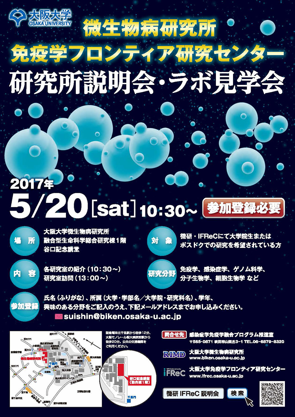 大阪大学微生物病研究所(微研)、免疫学フロンティア研究センター(IFReC)では、大学院修士課程・博士課程入学希望者及びポスドクでの研究を希望されている方々を対象とした、研究所説明会・ラボ見学会を開催いたします。 両研究所では、免疫学・感染学・ゲノム科学・細胞生物学を中心とした世界最先端の研究が展開されています。将来研究所で学びたい学生や意欲あるポスドクの参加を歓迎します。興味のある方は事前申し込みの上、ぜひご来場ください。