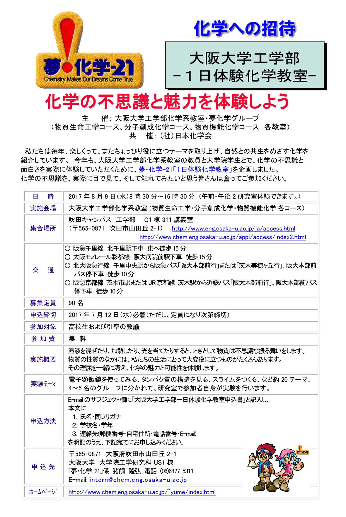 主催 :大阪大学工学部化学系教室 夢化学グループ(物質生命工学コース、分子創成化学コース、物質機能化学コース各教室)