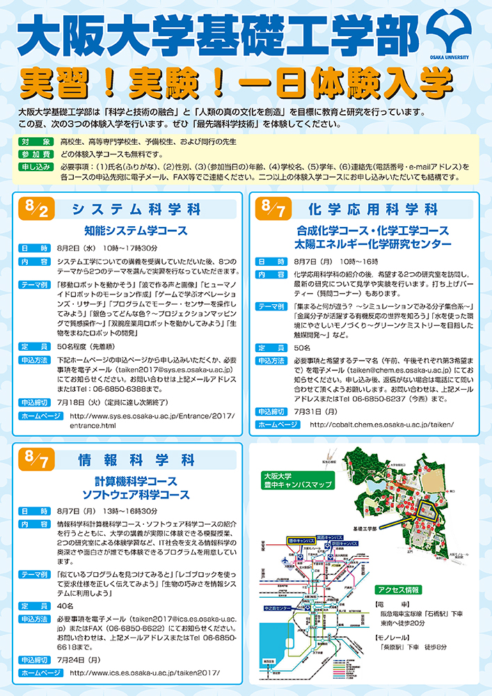大阪大学基礎工学部は「科学と技術の融合」と「人類の真の文化を創造」を目標に教育と研究を行っています。この夏、次の3つの体験入学を行います。ぜひ「最先端科学技術」を体験してください。