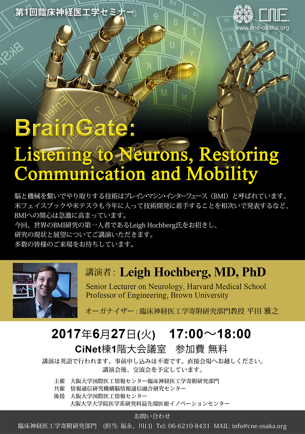 脳と機械を繋いでやり取りする技術はブレイン・マシン・インターフェース(BMI)と呼ばれています。 米フェイスブックや米テスラも今年に入って技術開発に着手することを相次いで発表するなど、 BMIへの関心は急激に高まっています。 今回、世界のBMI研究の第一人者であるLeigh Hochberg氏をお招きし、 研究の現状と展望についてご講演いただきます。 多数の皆様のご来場をお待ちしています。