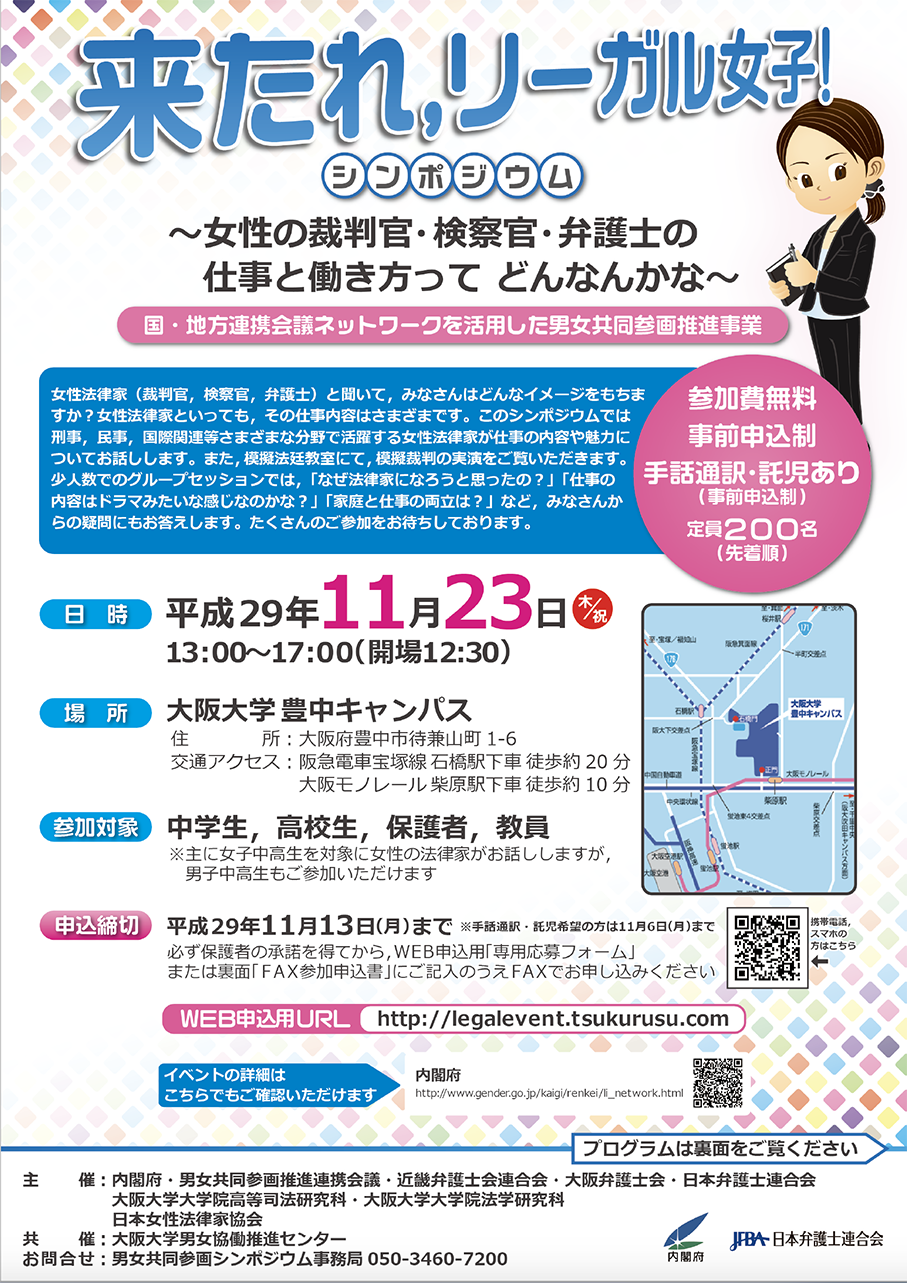| 主催 | 内閣府・男女共同参画推進連携会議・近畿弁護士会連合会・大阪弁護士会・日本弁護士連合会・大阪大学大学院高等司法研究科・大阪大学大学院法学研究科・日本女性法律家協会 |