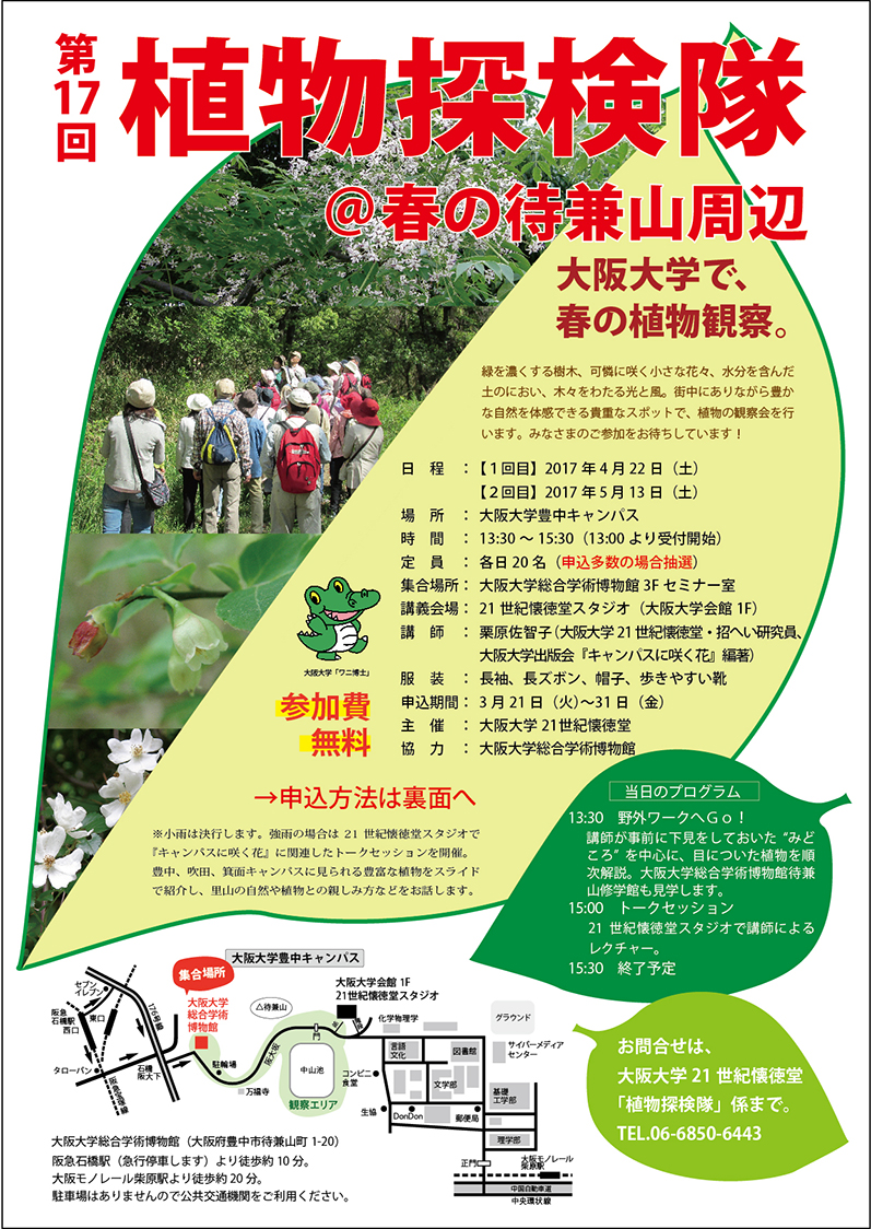 〒560-0043 大阪府豊中市待兼山町1-13大阪大学会館 21世紀懐徳堂 植物探検隊係